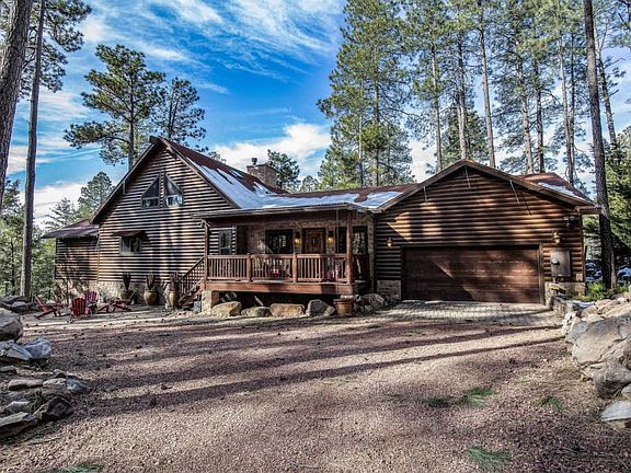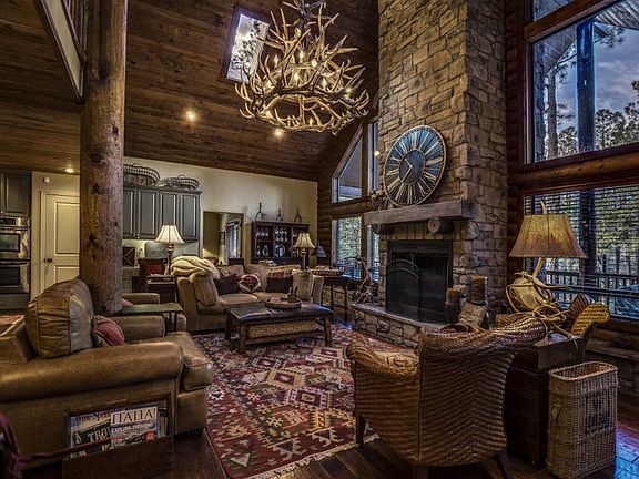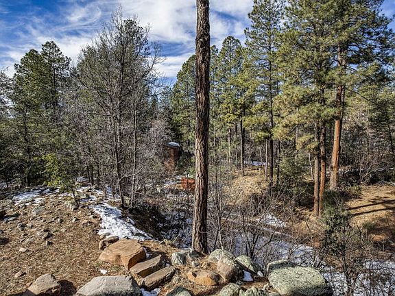 LOG CABIN LIVING AT ITS FINEST ... come home to this highly, interior designer's customed finished proverbial ''cabin in the woods'' along the creek, but enjoy luxury living in this highly appointed lodge! This impressive home features stone, massive custom front door, rusted metal roof and lots of wood accents with a Great Room that is grand, yet cozy, with a combination of stone walls, 5 foot antler chandelier, hand scraped Hickory wood flooring and a massive floor-to-ceiling stone fireplace, but then accented with warm wood detailing such as massive exposed log beams and tongue-and-groove ceiling. The beautiful gourmet kitchen granite countertops and granite backsplash, custom cabinets, all stainless steel Jenn Air Appliances with a gas cooktop and wine refrigerator. The open floor plan provides plenty of space for entertaining and guest seating and the breakfast bar is perfect for the family chef to delight friends and family. Enjoy eating in the open dining area with views in every direction. Or enjoy dining al fresco on the spacious covered balcony looking to massive Ponderosa Pines, full view of the Mogollon Rim and listen to the nearby creek the ultimate outdoor enjoyment! On the main level there is a grand Master Suite with En Suite Bath and laundry room, plus a second Guest Master Suite on the other side of the house, also with en suite bath. Ascend the stairs from here to access the Guest loft with living area and third bedroom option. House is available turn-key furnished by separate agreement, including all silverware, dishes, and chef accoutrements (excluding a few personal items and art). Just bring your toothbrush and start enjoying this one-of-a-kind custom built lot home in this pristine location, don't miss this opportunity ... visit now!