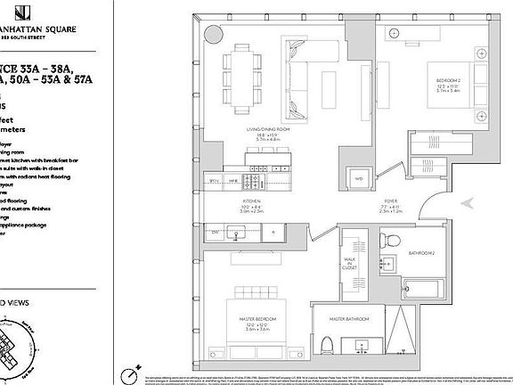The apartment features imported stone and custom finishes, floor-to-ceiling windows, 5 wide stained oak flooring, and an in-unit washer and dryer. The unit has a layout with split bedrooms and no wasted space. A beautiful open windowed kitchen with a breakfast bar & premium Miele appliance package flows seamlessly into the living room. The residence faces South East and has spectacular iconic Manhattan Bridge, FiDi, and East River views. Each bathroom features custom cabinetry, marble tile walls, a Wetstyle sink with glass vanity top, Dornbracht polished chrome faucets, and detailing; the master bathroom offers luxurious heated floors.