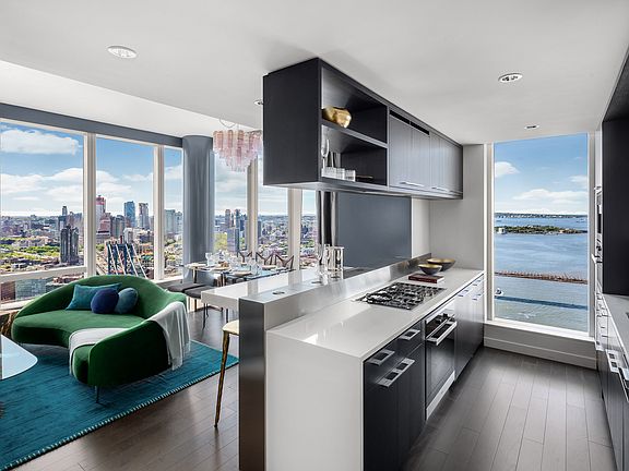 Residence 36C is a three bedroom, three bathroom with an open gourmet kitchen and breakfast bar. This spacious corner residence faces South West and South East, with spectacular sunset views overlooking NY Harbor and Downtown Manhattan. Warm, modern interiors are brought to life by the renowned design team at Meyer Davis Studio. This residence features imported stone and custom finishes, premium Miele appliance package, 5 wide stained oak flooring, master bath with custom wood cabinetry, marble tile walls and mosaic floors with radiant heat, under-mount Wetstyle sink with glass vanity top and Dornbracht polished chrome faucets and a washer and dryer.