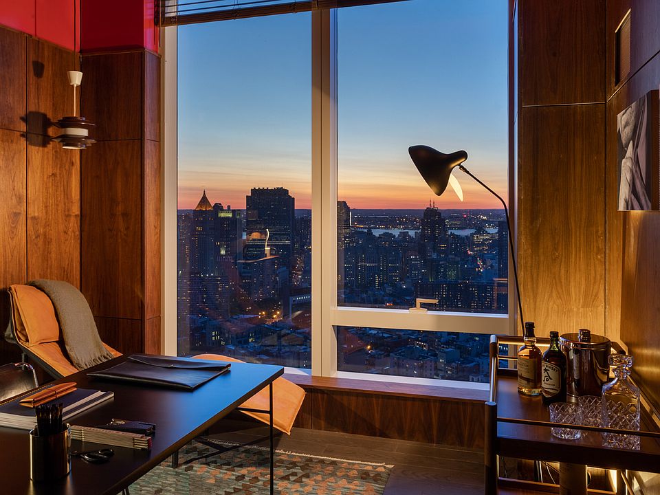 Residence 41L is a 1,123 square foot two bedroom, two bathroom with an open gourmet kitchen and breakfast bar. This spacious corner residence overlooks the expanse of Empire State and Midtown in the North West, and NY Harbor, East River, and Downtown Manhattan views in the South West. Warm, modern interiors are brought to life by the renowned design team at Meyer Davis Studio. This residence features imported stone and custom finishes, premium Miele appliance package, 5" wide stained oak flooring, master bath with custom wood cabinetry, marble tile walls and mosaic floors with radiant heat, under-mount Wetstyle sink with glass vanity top and Dornbracht polished chrome faucets and a washer and dryer.