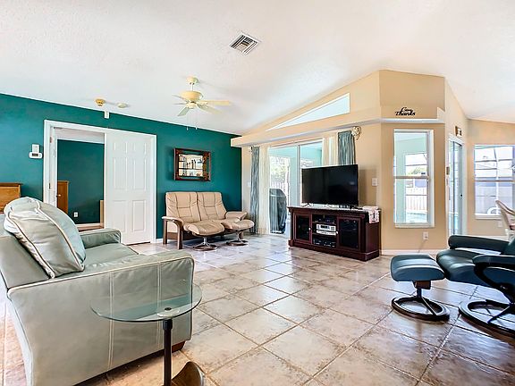 Welcome to your dream retreat in the desirable Summers Creek community! This 3/2 stunning POOL home boasts vaulted ceilings and a spacious, sunlit split floor plan. Beautiful ceramic flooring throughout, complemented by engineered hardwood in the cozy bedrooms. The heart of this home, the kitchen, is a chef's delight with its ample cabinetry space and gleaming stainless-steel appliances, including a convenient gas stove and breakfast bar for casual dining. The open dining area and family room provide great entertaining space. Retreat to the expansive master suite, complete with a generous walk-in closet, double sinks, and a walk in shower. Outside the backyard oasis beckons with a covered patio overlooking the screened pool, ideal for entertaining or simply unwinding in privacy, thanks to the fully fenced yard. Updates include 2021 Roof, 2023 A/C, 2023 water heater. Don't miss the opportunity to make this your own slice of paradise, schedule a viewing today!