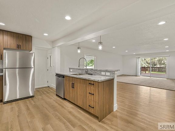 Fully remodeled and updated 4 bedroom, 2 bathroom home located directly across from Porter Park in the heart of Rexburg! This home blends 1950s charm with modern updates. Inside you'll find brand-new LVP flooring, carpet, and fresh paint throughout. The kitchen has been beautifully upgraded with granite countertops, new cabinetry, and stainless steel appliances. The bathrooms feature subway tile, granite counters, and new hardware. The oversized family room provides plenty of gathering space and opens directly onto a brand-new deck, perfect for entertaining or relaxing. The fully fenced backyard offers a full sprinkler system, mature trees, and plenty of green space. Unique touches include quaint windows and original built-in cabinetry that preserve the home's charm. Major upgrades include a brand-new gas forced-air furnace and central A/C, keeping the home comfortable year-round with low utilities. The location is unbeatable—walk to BYU–Idaho, nearby dining, shopping, and enjoy community events at Porter Park right outside your front door. This move-in ready home offers comfort, convenience, and timeless appeal in one of Rexburg's most desirable neighborhoods!