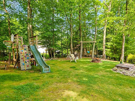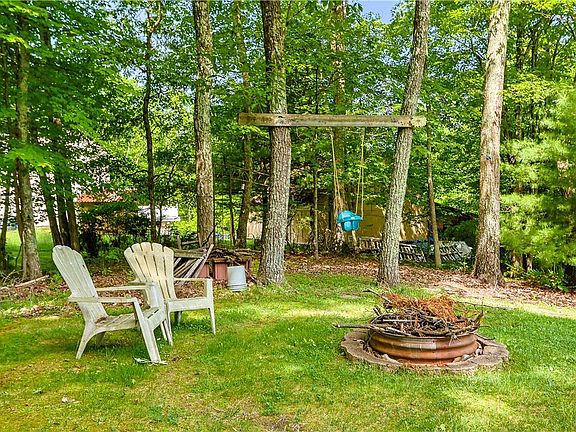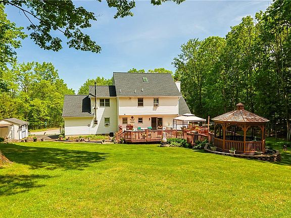 Ask how to receive a $2,000 credit towards closing costs or lowering your interest rate! A conveniently located 4 bedroom, 2- 1/2 bath Colonial home in Pleasant Valley schools! Plenty of space on all levels from the 2 living areas on the main level, plus a bonus finished 3rd Floor, and finished basement! NEW Roof in 2021, new skylights, updated Powder Room and nice white kitchen. Hardwood floors within the living and dining rooms, with french doors and fireplace. Hardwood floors also in the Primary bedroom with spacious en-suite bath. Large deck overlooking the backyard for outdoor entertaining and family get togethers. Paved driveway for plenty of parking, 1 car garage, and 2 storage sheds for extra storage, with one having an attached dog kennel.