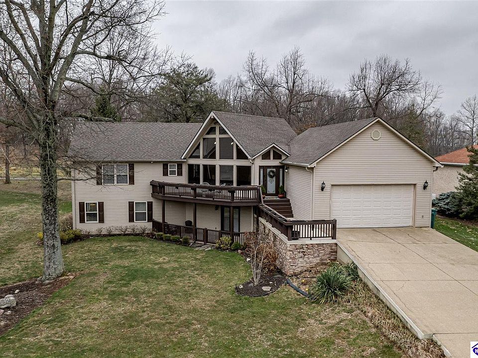 Fine Living, in the Heart of Elizabethtown! This unique gorgeous home is situated on a picturesque street, with beautiful mature trees and a lovely golf course. Walk out the backyard to the 2nd fairway of the Heartland Golf Club! Be captivated as you walk up the front stairs and open the door to a huge, vaulted ceiling with windows galore that offer views from the front and the back of the home. There is a cozy fireplace and the adjacent kitchen and dining room that are inviting with plenty of beautiful upgrades and features. The main level offers the spacious primary suite, with a door leading onto the back deck and a primary bath with a very large countertop with double vanities, a whirlpool tub and separate shower. The main level also has one guest bedroom and bath and a conveniently located laundry closet. The main level also has a 2-car garage with a set of stairs that lead to a storage room in the upper level of the garage! The basement gives you a plethora of rooms and options, there is practically a whole studio apartment. There are plenty of windows, that give an abundance of light. A huge, gorgeous area that offers loads of space for a giant sofa, a bed and a kitchenette/bar. There is a perfectly placed double-sided fireplace that finishes it out with perfection! The 3rd guestroom, bathroom, and room that is being used as a home gym, another room that is being utilized as a pocket office and finally a massive room that will allow so many possibilities and options, current it is the cutest kid playroom! This home is unquestionably unique and unforgettable.