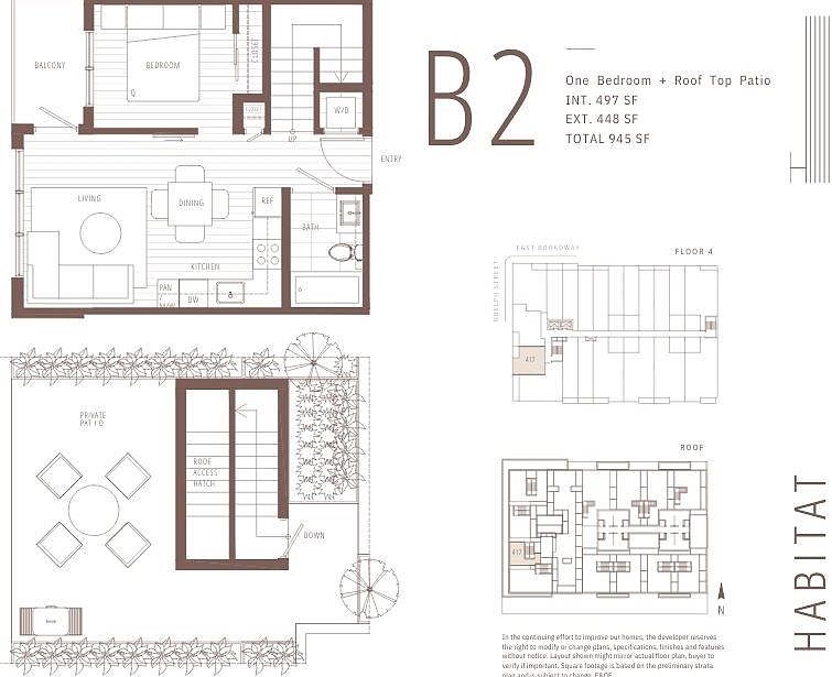ROOF TOP PATIO!!! Habitat is a boutique building by award winning Formosis Architecture. This 497 sq/ft 1 bed unit on the TOP floor has its own 448 sq/ft private rooftop patio + Balcony. (only unit with this floor plan in the building) equipped w/ Gas splitter (BBQ + Firepit) and water bib. Inside features contemporary laminate flooring throughout, matte cabinetry, Quartz countertops, under cabinet LED lighting, an integrated Fulgor Milano appliance package, sleek matte black hardware & plumbing fixtures. Building amenities include a stunning rooftop patio with an outdoor kitchen, dining area & fire pit lounge and a workspace amenity room. Including 1 Parking / 1 Bike Storage. Located in the heart of Mt Pleasant, centrally located to shopping, transit, restaurants and more. One of a kind!
