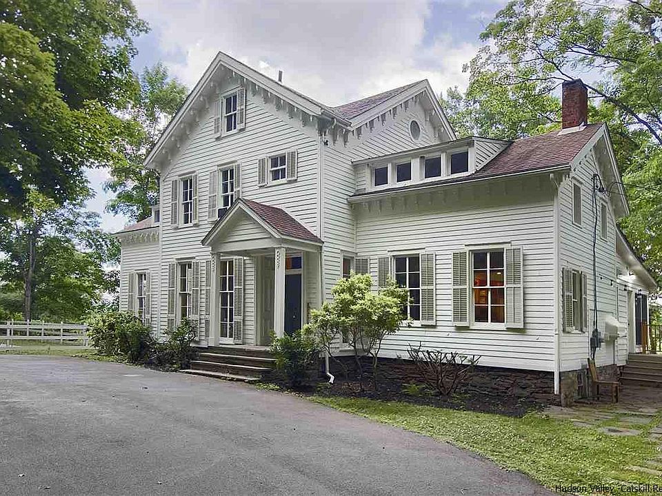 Extraordinary example of an 1800's architectural style rarely seen in Historic Marbletown. This stunningly restored Hudson Valley Masterpiece, has retained it's historic integrity. Majestically sited on a knoll and surrounded by mature trees and sweeping lawns this is a prime and convenient Hudson Valley location. Enter through grand double doors into spacious yet intimate, high ceilinged sun filled rooms with floor to ceiling windows, original wood floors, gorgeous mouldings and trim. Expertly designed new kitchen leads to both a breakfast room and spacious Great Room. The roomy and charming breakfast room has a fireplace with bee hive oven and window seat to enjoy a book on a cold winter day. The window lined Great Room overlooks lawn and farmland and is the perfect place for holiday parties or relaxing while taking in the view. Beautiful staircase leads to high ceilinged bright bedrooms with wood floors and views from each of the windows. Possible third floor MBR suite or spectacular studio/office. The sun filled property has multiple outdoor living areas including stone patios and decks. The inground pool overlooks pastoral setting with 3 stall barn and meadow. This is a special, private, restored historic property with a casual elegance rarely seen.