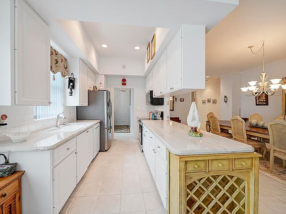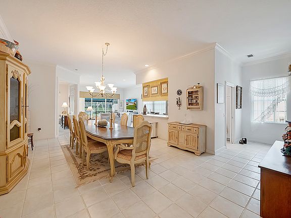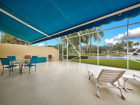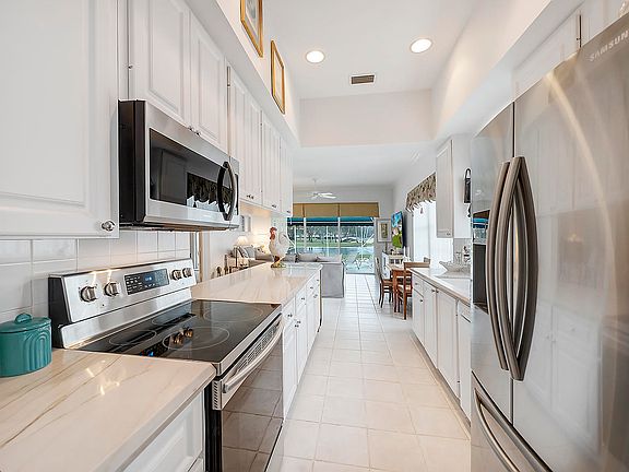 This home has been gently used by its snowbird owner. It is tucked away on a quiet cul-de-sac with spectacular open water views. The home has many windows and sliding doors, making it very light and airy. It is 3 bedrooms, 2 baths with a split floor plan, volume ceilings, neutral tile floors and custom crown molding throughout. The kitchen features white cabinetry and newer appliances. There is a great room adjacent to the kitchen that has commanding views of the water and one of Venetian-style bridges that are throughout the community. The sliding doors from the great room bank open to the spacious screened patio overlooking the water. This is a great space for entertaining, and there is an electric retractable awning for you to use as needed, for shade from the heat or protection