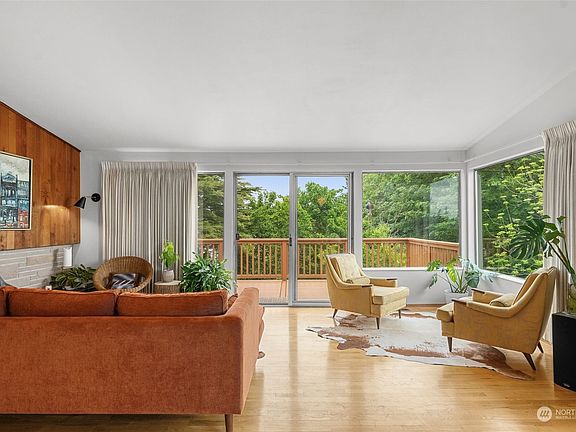 Magnificent Mid-Century Modern with surprising Lake & Mtn views! Slate entry leads to sizable living room showcasing oversized windows to capture natural light & territorial vistas towards Lk WA & the Cascades. Wood-burning statement fireplace, original hardwoods & view deck. Efficient galley kitchen w/new SS fridge & dishwasher, flows to dining area. Fantastic floorplan offers 3 bedrooms + 2 baths on the main; including Primary w/ensuite bath newly remodeled: new vanity, shower tile & flooring. Expansive daylight lower level offers 4th bedroom, rec/family room, laundry, PLUS generous bonus space perfect for creatives! Private backyard w/mature plantings offers a serene & green space to relax. Carport pkg, dead-end st, pre-inspected!