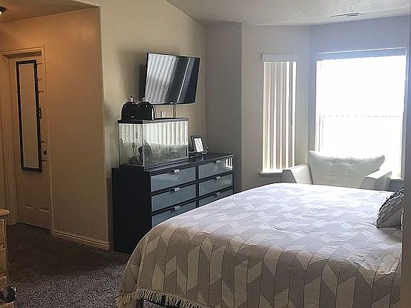 Top-Floor unit in excellent condition! Amazing location close to the freeway and Smiths Marketplace. Open spacious floor plan with solid surface countertops and vaulted ceilings. Replaced carpet and water heater within the last year. Nice covered balcony off of the living room. 1-car garage with additional parking in driveway. HOA includes: Clubhouse, pool, playground, landscaping, snow removal, TV & Internet. ALL information including square footage and measurements are deemed reliable but not guaranteed. Buyer is advised to obtain their own measurements and complete due-diligence.