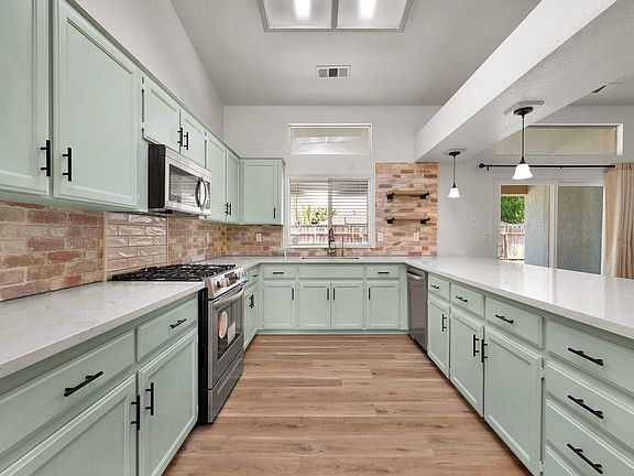 This former model home has a spacious open floor plan and a year ago was extensively remodeled. The home shows like new with fresh paint, new flooring, appliances, counter tops, blinds, glass sliding door, plumbing and electrical fixtures and newer HVAC systems. The kitchen offers a pantry, sitting bar, reverse osmosis, and lots of counter and cabinet space. The great room features a fireplace, entertainment center and speakers. The owner's suite has a walk-in closet and dual sinks. Both bathrooms have been updated too! The oversize garage has a large extended area offering numerous overhead lighting and its own HVAC system. The property has a cute curb appeal and covered patio and is located near great schools. Make an appointment to come see for yourself what this property has to offer..