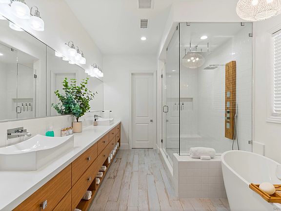 Beautiful single-story home built in 2018. A rare opportunity to own a home in the master-planned community of Robertson Ranch built by luxury home builder, Toll Brothers. Updated finishes throughout the home include quartz countertops, 48-inch dual fuel range, waterjet backsplash, and luxury hardwood flooring. Large spa-inspired primary bathroom with dual rain shower heads, oversized vanity, double sinks, and a freestanding tub. Robertson Ranch features a resort-like recreation center, including a pool, spa, outdoor fireplace, parks, and trails. This home is conveniently located near Legoland, beaches, golf courses, shopping, and entertainment.