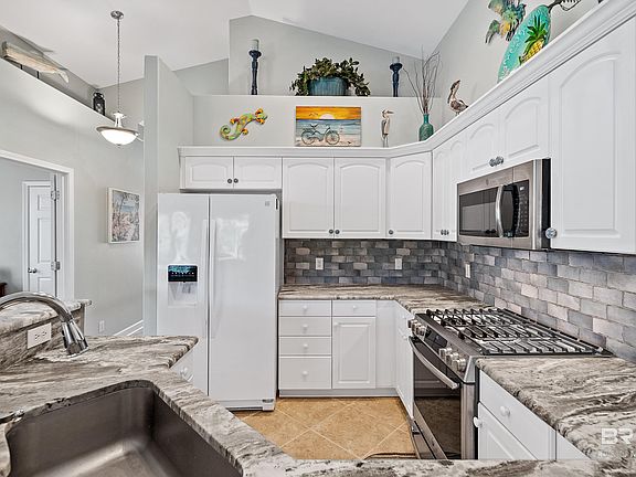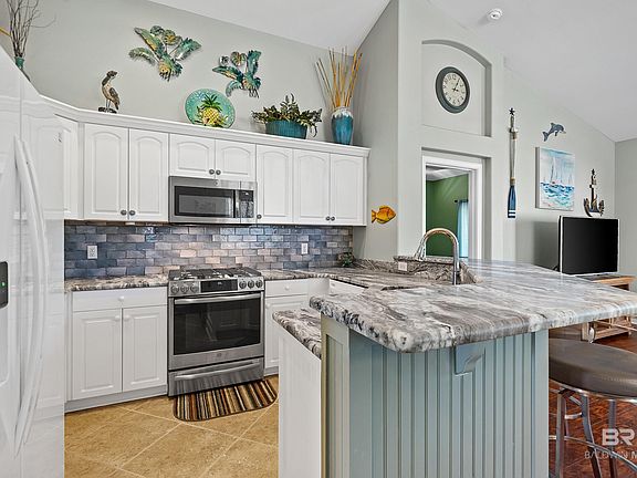 This nicely updated single-story home features deeded beach access and is priced to sell! The home is being offered in turnkey fashion with all furniture and personal property, including a brand-new golf cart! Perfectly situated on a lot that backs up to a community lake and the Gulf State Park, the home is built on a slab, has no stairs, and offers a low maintenance lifestyle. As you enter the home and your feet glide across the engineered wood floors, you are greeted by an open-concept layout with vaulted ceilings in the kitchen and living room. The kitchen is equipped with granite countertops, over-cabinet lighting, a five-burner gas range, and an elevated bar with seating for two. The master suite is outfitted with an updated vanity featuring granite countertops and soft close cabinets, a built-in linen cabinet, and a large walk-in shower. When it is time for some fresh air, you are welcomed by a spacious screened patio featuring tile floors and a new insulated ceiling. The house also boasts a hard-coat stucco exterior, an updated guest bathroom vanity with granite countertops and soft close cabinets, a new drier (2025), a reinforced concrete driveway (2024), a new window on the south side of the house (2024), a double car garage with a new hurricane-rated garage door (2022), a new roof (2022), a new water heater (2021), a new HVAC unit (2019), and natural gas service for the range, drier, and water heater. Windward Lakes is a gated community conveniently located in the heart of Orange Beach offering a robust amenity package and easy walking access to a plethora of retail stores, dining attractions, and the Gulf of Mexico. Community amenities include deeded beach access via a gated boardwalk, an outdoor pool, recently renovated clubhouse, fitness center, tennis and pickle ball courts, a basketball hoop, and HOA fees that includes private lawn service, pest control, a termite bond, landscape irrigation, and trash service two times per week. Buyer to verify all
