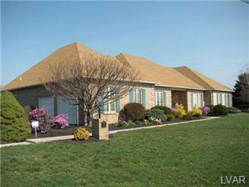 One floor living at its finest. This 3556 sq. ft. all brick ranch sits on a lovely 1.7 acre lot w/ a panoramic view of Lehigh Valley. Enter this lovely home and find hardwood throughout hallways, dinning room, and library/bed. The large eat-in kitchen is perfect with center island, desk area, pantry, plus lots of cabinets and access to garage, separate entry and laundry room. The butler's pantry with marble counters hosts a perfect buffet while dining in large DR with French doors to hallway. The living room fireplace is surrounded by a warm stained mantle and custom woodworking. 5 bedrooms are spacious with large closets and walk-ins. The finished basement is complete with family room and large office w/4 walls of built in bookcases. Always a breeze to keep you cool in the summer on the lovely patio. Projected taxes decreased to $6716.57