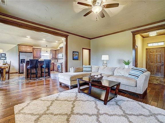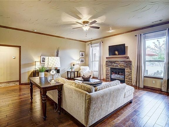 You will fall quickly for this impressive home in Grove School District designed with function and style in mind. A true 4 true bedroom, 2.5 bath, 2.5 car garage plan w/10ft ceilings, stained woodwork, & so much storage. The open concept living area spans 20' x 20' and has wood flooring, fireplace with stone detail, large windows with wood blinds, & crown molding. The tiled kitchen has granite counters, a spacious pantry, island with breakfast bar, and dining area with patio access. The split bedroom floor plan has zero shared walls, windows in each room, double door closets, storage in every hall, & a full size linen closet in the guest bath. The master suite has back patio access, large windows, double sinks, a tiled shower plus a whirlpool soaker tub and walk in closet. The extra large backyard is completely enclosed with stained wood panel fencing, has a peach and pear tree, stained patio and room to play & the curb appeal is hard to beat with added landscaping details.