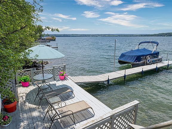 Charming year round home with 66' of private Skaneateles waterfront, permanent dock, fantastic grassy lakeside yard, and 2 story garage make this offering on the east side perfect for buyers looking to experience lake living at its best. This wonderful property is just minutes (4 miles) from the village of Skaneateles. The well-built ranch hosts hardwoods through-out (under carpeted areas as well), a sunny kitchen, 2 large bedrooms, full basement, and two-level garage with half bath. The developed private waterfront features a large permanent dock great for entertaining, additional seasonal dock, hoist and mooring which will all convey. The expansive lakeside yard has been home to many parties, outside barbecues, outdoor games, and sunset viewings over the years. Recent updates include new roofs on house and garage, stairs to lake, and continuous maintenance to the property. Location, private frontage, and lot size offer buyers an ideal opportunity to enjoy this lake property as a current easy get-away or investment opportunity.