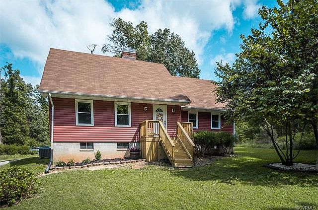 Price improvement- now priced below appraised value! Amazing home nestled on 11+ private acres in Powhatan- and just 15 min from Route 288! Walking in the front door you're greeted by a brick accent wall and arch that lead to a stunning family room with wood-grain laminate flooring and cozy fireplace. Open to the family room is a cheerful and spacious eat-in kitchen with tons of cabinet space, new countertops, and stainless steel appliances- all highlighted by a brick wood-burning fireplace with custom insert. Two BR's and full bath downstairs and two BR's and full bath upstairs. Master BR has a vaulted ceiling, ceiling fan, hardwood floor, and walk-in closet. Secondary BR's are large and feature hardwood floors and spacious closets. Master bath has dual sinks in a custom built vanity with a separate shower/toilet area. Covered back porch is perfect for enjoying lazy mornings relaxing and watching the kids/pets play in the fenced back yard. Barn is perfect get-a-way spot or workshop with water and electricity. Renovated in 2015 with new HVAC system, siding, vinyl windows, waterproofed basement (with lifetime warranty), new fixtures throughout, and more! Welcome home!