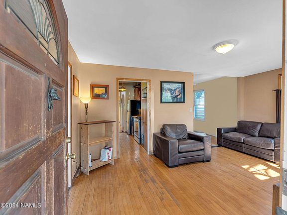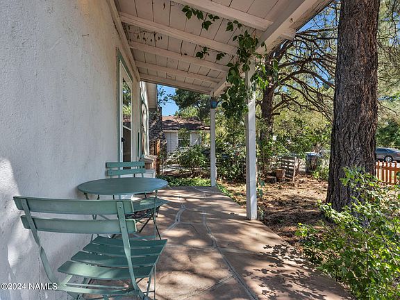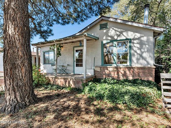 Discover your new home in the established residential area of Sunnyside! This inviting residence boasts hardwood flooring and is surrounded by mature, old-growth trees, creating a serene atmosphere from the moment you walk through the front door. Well- maintained by its owner, the heart of this home is the updated kitchen that connects to a cozy living room, complete with a Jotul stove nestled on a native rock hearth—perfect for those chilly months. The versatile rear room offers possibilities as a den, dining area, or bonus space to suit your needs. Rich in history, this delightful 1945 home is believed to have been moved from Jerome to Flagstafff. Step outside to find your own wooded retreat with front and rear covered decks, space for a garden, children and pets and a detached garage.