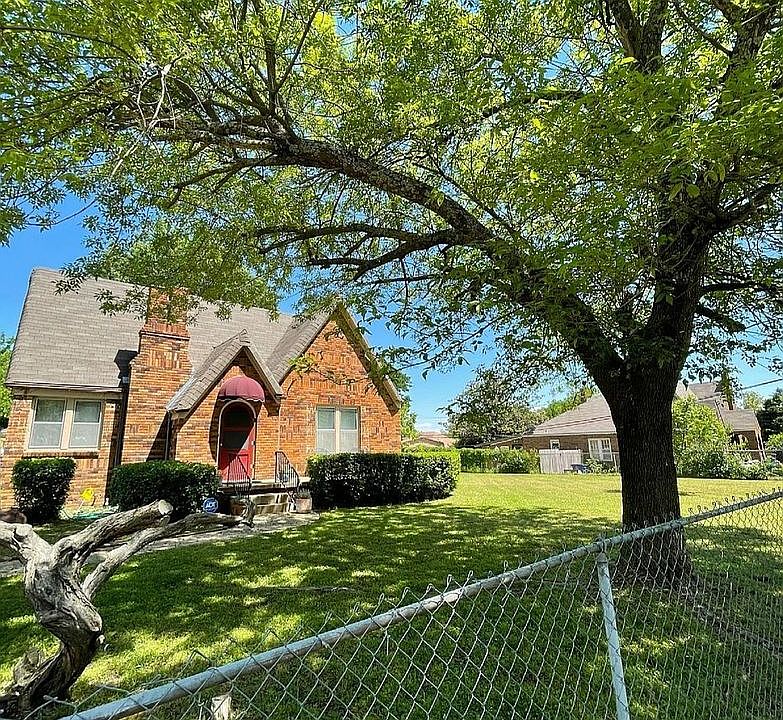 Tudor style, brick exterior, steep pitched gabled roof lines; playful elaborate chimney; floored in attic; home sits on 2 lots.