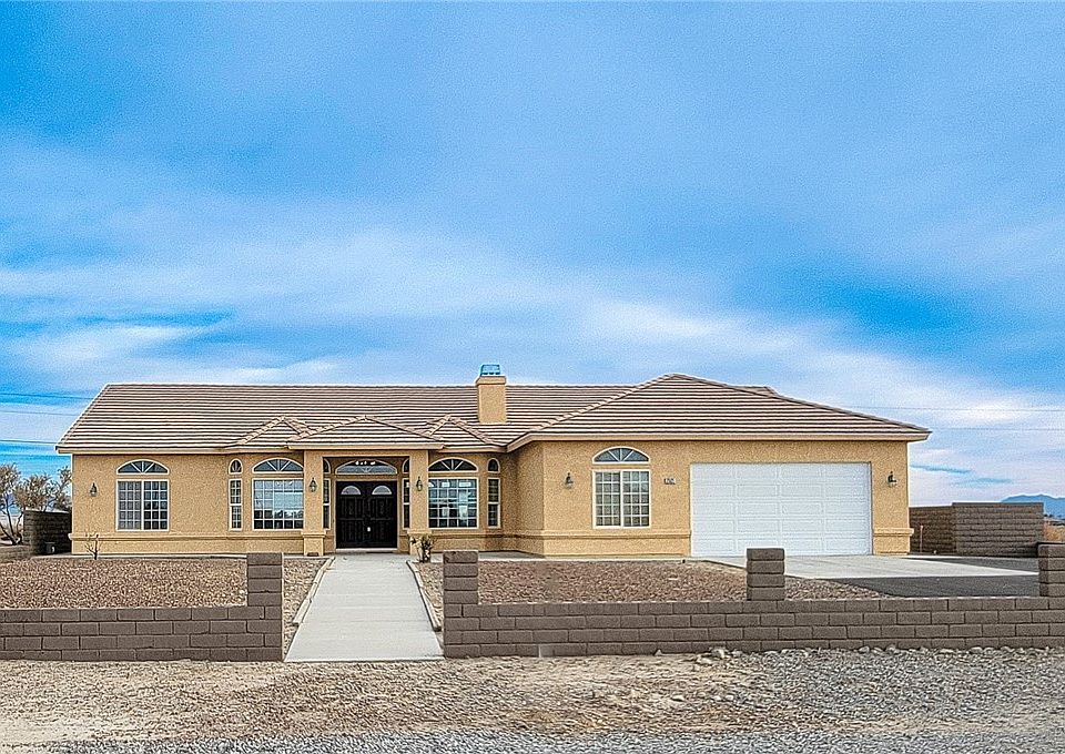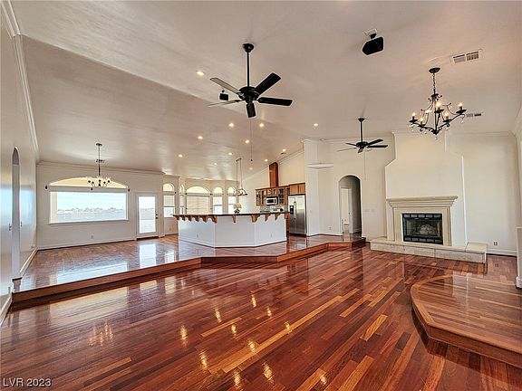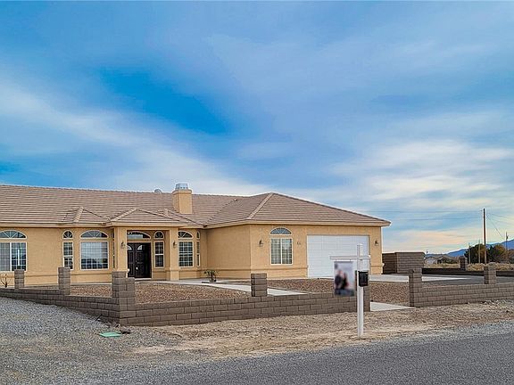 This stunning one-story, 3 bedroom, 2 bath centrally-located home boasts rich hardwood floors throughout, fresh paint inside and out, crown molding, & much more! Double front doors open into sunken living & open-concept Great room with vaulted ceilings, cozy bay windows, & an embellished fire place! Large entertainer's kitchen includes granite countertops, island, long breakfast bar, dining nook, & formal dining area. Massive primary bedroom includes huge custom walk-in closet, exterior door, spacious bathroom w/ double sinks, Roman tub, & walk-in tiled shower w/ body jets! Enjoy an oversized backyard w/ long & wide covered patio, cinder block fence, & plenty of room for pool, firepit, or anything else you can imagine! Room for RV parking & your desert toys, too! Huge garage can fit 3 cars, or two plus storage & home gym! Come see this gorgeous & warm house in person! No HOA, no neighbors behind you, and endless mountain views. Call today for a showing appointment!