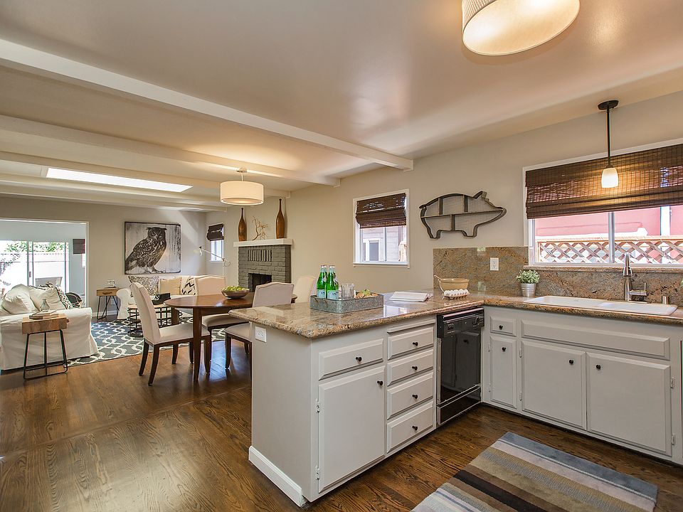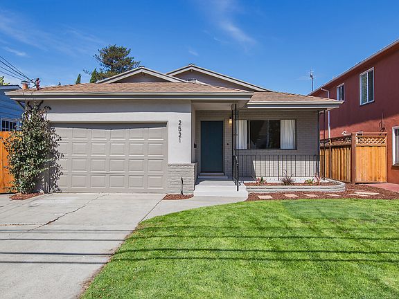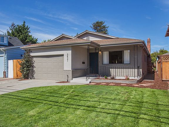 Built in 1968, this handsome mid-century home is located in Alameda’s East End, with three bedrooms, two bathrooms, a formal living room, an open kitchen/family room, playroom, and an attached garage. The home also has a large, landscaped rear yard, and is conveniently located near Otis Elementary School, Alameda’s South Shore Center, the beach, and many parks and shoreline green spaces. The home has a wonderful mid-century look and feel, beginning with the brick and stucco façade and several decorative gables. The original wrought-iron railing highlights a covered walkway to the front door and encompasses the front porch. New landscaping compliments the front yard and completes the home’s charming curb appeal. Once inside, a view straight through the house from the entrance to the beautiful rear garden brings in the outdoors and creates a sense of light and added space. The spacious living room at the entrance to the house feels welcoming, and features newly refinished hardwood floors, a gallery wall, and a fixed picture window with sliding windows on either side that bring plenty of natural light into the room. An open entryway connects the living room to the open kitchen/family room combination. The kitchen maintains the original mid-century cabinetry, which works seamlessly with the upgraded granite counters and backsplash, and the refinished hardwood floors bring warmth to the room. Appliances include a Jenn-Air cooktop, a Maytag dishwasher and dual GE ovens. A large sliding window and new pendant light are over the divided porcelain sink, and a large pantry adjacent to the kitchen offers extra kitchen storage. A granite-topped breakfast bar is perfect for casual meals, and separates the kitchen from the family room. The inviting family room space features a wonderful brick, wood-burning fireplace with a raised hearth, and is the focal point of this comfortable room. A large skylight set into the beamed ceiling brings bright light into the room, as do windows on either side of the fireplace. A spacious playroom is located off of the family room, down a few stairs through a wide, cased opening. Sliding doors open to the beautifully landscaped backyard. Many additional windows make this a light, bright room, and a large closet provides storage. The private master bedroom includes an en-suite bathroom and several closets for ample storage. The bedroom has the hardwood floors and windows that overlook the fruit trees in the backyard. The master bath has been updated to include a ceramic tile floors, a freshly painted vanity with a white Quartz countertop, new mirrors and sconces, and a recessed sink with a new faucet. The large walk-in shower has a window that can be opened for ventilation, and is handicap accessible. Two additional bedrooms and a second full bathroom are down a hallway off of the kitchen. Each bedroom has hardwood floors, a roomy closet with bi-fold doors, and wide windows that have views of greenery. The second bath and linen closet is conveniently located between the two bedrooms, and the bathroom include a shower over bath, brilliant white tile bath/shower surround, a ceramic tile floor, a white Quartz vanity top and a new mirror and sconces. A window with opaque glass for privacy provides natural light. A special feature of this attractive house is the large rear yard that is fenced for privacy. Mature fruit trees include apricot, lemon and plum, and a blooming bottlebrush tree provides lush color. Two patio areas make outdoor entertaining easy, and flower and vegetable beds are perfect for the avid or weekend gardener. 2521 Otis Drive is ideally located close to Alameda’s acclaimed public schools, Krusi Park, Encinal Market and the restaurants and shopping at downtown Park Street and the South Shore Shopping Center. Commuting to San Francisco is a breeze on the San Francisco Bay Ferry, and Interstate 880, Fruitvale BART and Oakland International Airport are just minutes away.