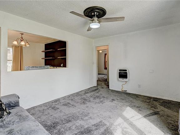 This Home is 3bed 1bath with lots of Updates: Paint 2022, Wood accents/Shutters 2022, Newer Windows 2022, Back door 2023, Carpet 2023, Ceiling fans in all rooms and living room 2023. Bathroom new sink, mirror, toilet painted insert, vinyl flooring 2023. Water heater 4y old. Kitchen- Gas stove facing living room, sink, cabinets and floating shelves. This home is small but has a lot to offer. Garage has been converted to one bedroom with laundry room next to it that has backyard access. Schedule Showing today!!