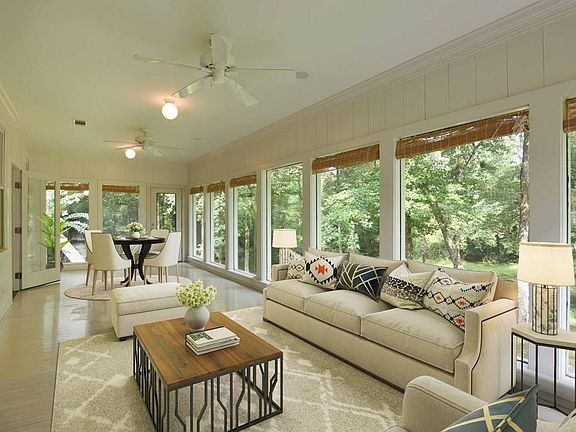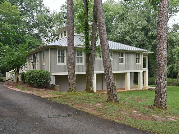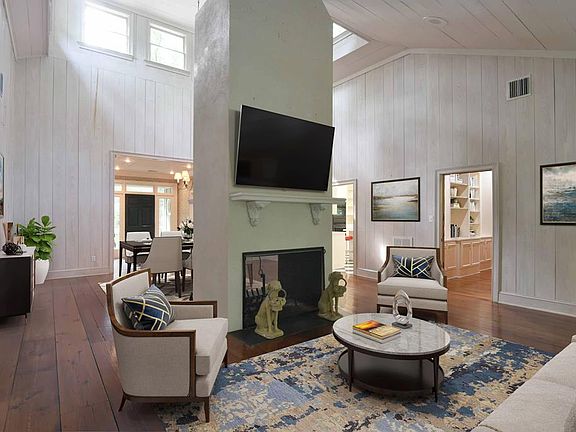 ONE OF A KIND HOME IN DOUBLEGATE! Gorgeous Home overlooking the blue hole and flowing creek on Approximately +/-2.46 Acres, just steps from the Doublegate Golf Course. This one owner home was built with love and attention to detail! (1) Foyer Entry with Black & White tile & stunning wallpaper in the perfect welcome to guests as they catch their breath in awe of the 2 story great room! (2) The incredible Great Room has a flexible design with a center double sided fireplace, alternating width, wide plank heart pine floors harvested from a local family farm and pine walls with a pickled wash. Above the windows surround a beautiful pine ceiling and allow beautiful natural light and moon light to cascade over the room. (3) The Kitchen is just off the Great room, with pocket doors for privacy. 3 Large windows over the kitchen sink, with views of the tree tops, make you feel as if you are in a tree house! The kitchen also features ample cabinetry, center island, display cabinets, pantry, double oven, refrigerator and cooktop. (4) The Sunroom will be your favorite room! The inspiring room overlooks the creek and the enchanting backyard. The painted white floors make you feel like you are floating above an oasis. There is also a view of the signature hole on the golf course across the street! This is such a flexible space that can accommodate a sitting area and a dining area! Enjoy all the wildlife (deer, turkey & birds) from the comfort of this room morning and night! (5) Also on this level is a handsome study/ den with pecky cypress walls and ceilings and a large built-in cabinet. (6) The primary suite with a HUGE walk-in closet connects to the Laundry/ Work room. This space is ample size and features an extra desk, workstation and additional storage, all located on the main level. (7) There is one guest bedroom and guest bath just off the left side of the foyer entry, perfect for guest access. (8) Downstairs you will find 2 additional guest bedrooms with a shared bath. (9) Access to the 2 car carport and additional parking area is also on the second lower level. (10) The lower covered terrace is perfect for entertaining and comes complete with a custom table made to fit the space! Imagine hosting family and friends for dinner with the creek in the background! At night there is beautiful outdoor lighting as well. (11) storage room (12) The property includes 2 lots, bordering both sides of the creek! Complete with the magical red bridge! FULL VIDEO TOUR