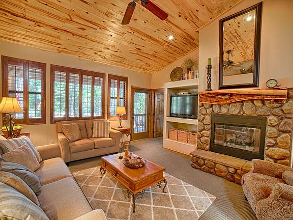 Gorgeous turn key ''Arizona'' model in Cardinal Landing neighborhood of Torreon Golf Club. This fully furnished 2 bed 2 bath cabin in the pines features an open Kitchen, Dining and great room layout with aspen tongue and groove vaulted ceiling in the great room, a custom stone fireplace, Hand peeled Juniper mantle & upgraded Knotty Oak cabinetry. Beautiful Plantation shutters add character and charm. With special hardware, ceiling fans, lighting and sky lighting. This cabin has rustic touches and upgrades throughout. Clean two car garage with shelves and painted concrete slab. Enjoy four season living and an outdoor recreational lifestyle from your mountain cabin. Torreon association membership includes access to ...