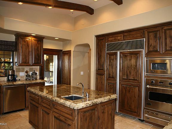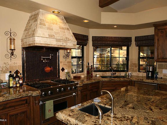 This private hacienda retreat was created for entertainment and resort living. This beautifully furnished home boasts chef kitchen, family room with canterra fireplace, large bar, media room, dining room with wood burning fireplace and media room - perfect for entertaining. Updated kitchen that features alder cabinets, custom granite countertops, Viking and Subzero appliances. The home has three beautiful en-suites with hickory wood floors, tumbled turkish stone, custom canterra stone features throughout and private patios. Master suite includes wood floors, plantation shutters, walk in closets, jacuzzi tub and fireplace. The backyard has a Mediterrranean pool with private hot tub, ramada, covered patios and fountains. Very private and close to all action. Oversized three car garage.