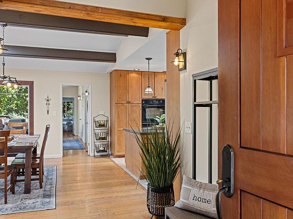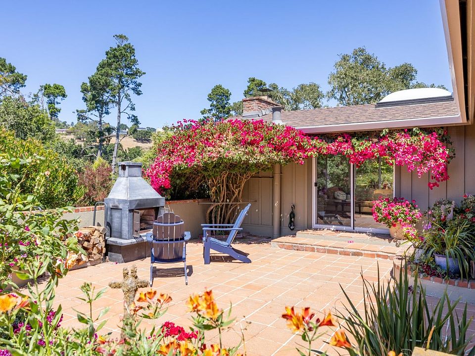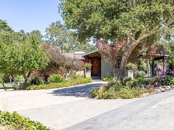 Nestled on an oak lined cul-de-sac, this delightful property offers a 3 BD, 2 BA single-level home on a beautifully landscaped appx half-acre with separate workshop and an array of outdoor living spaces. A warm welcome inside, vaulted open beam ceilings, wood floors, and abundant natural light through skylights and surrounding windows display views of gardens, forest, and hills. Living room features a wood-burning fireplace and opens to kitchen and dining space. Kitchen offers a large island, double ovens, gas stove, stone floors. Living room opens to patio with outdoor fireplace and bougainvillea canopy. Expansive back deck offers more privacy, hot tub, and plumbed gas BBQ. Mature landscaping of lawn, fruit trees, flowers, vines and veggie garden. Finished workshop with cedar walls, vaulted ceiling and French doors perfect for office or hobbies. Separate storage shed. Plans and permits to add a 2 BD, 1 BA ADU are well underway with the County. Top-rated Carmel Unified School Dist.