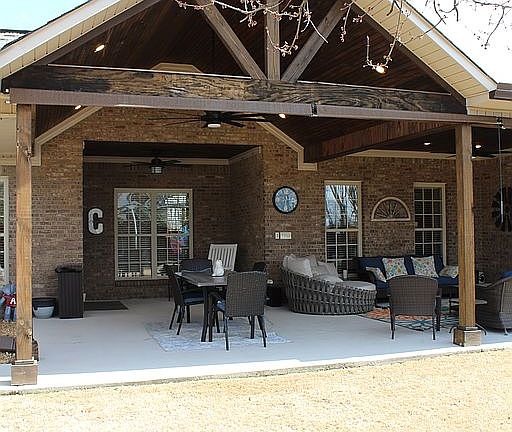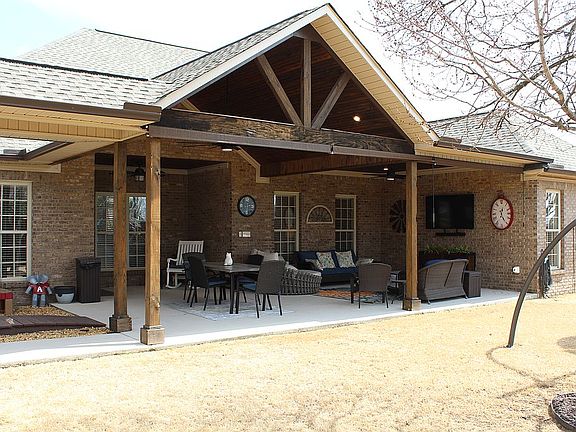 The master suite offers a large soaking tub, a walk-in tiled shower, and a spacious walk-in closet. Outside, enjoy the extended 30’x16’ covered patio featuring a vaulted tongue-and-groove ceiling, recessed lighting, and three ceiling fans—perfect for entertaining or relaxing.