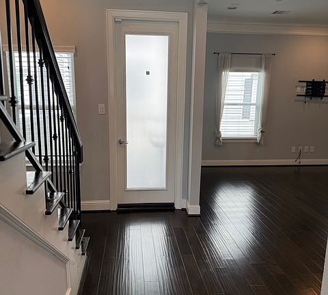Spacious three-story home featuring an open-concept layout with modern finishes throughout. The gourmet kitchen offers granite countertops, stainless steel appliances, dark wood cabinetry, and pendant lighting over the island, seamlessly flowing into the dining and living area with hardwood flooring and abundant natural light. A private balcony provides outdoor space, while the top floor deck offers expansive views. The home includes a large laundry room with storage, generously sized bedrooms, and a primary suite with a walk-in closet, dual vanities, soaking tub, and glass-enclosed shower. Neutral tones, recessed lighting, and ceiling fans enhance comfort and style.