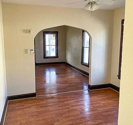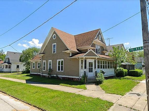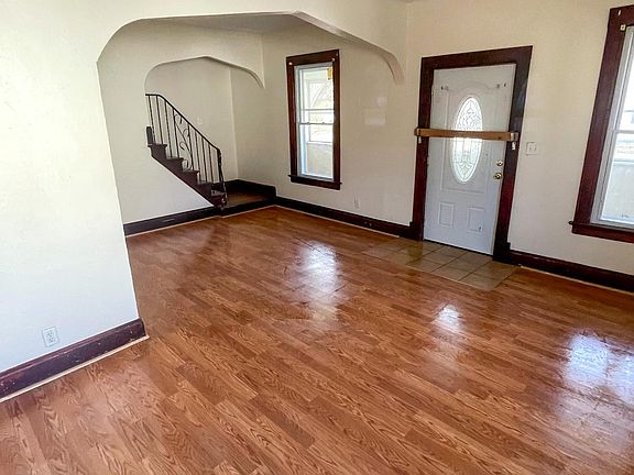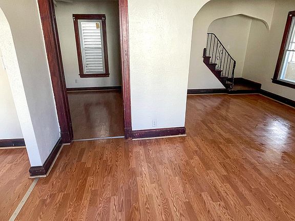Spacious 4 bedroom home with 2 full baths. Enclosed sun porch. Large living room and formal dining room separated by archway. Bright and sunny updated eat-in kitchen with oak cabinets and dishwasher included. Separate laundry room. Downstairs bathroom with combo tub/shower. New vinyl flooring in kitchen, laundry and bath. One bedroom is also downstairs. Upstairs are 3 more bedrooms with all new carpet and the second bath with combo tub/shower and tile flooring. Original trim and solid wood doors throughout. Some newer dual pane windows. Clean unfinished basement. Corner lot has grassy back yard and rear concrete driveway with parking for 2 cars.