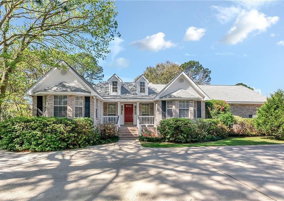 Beautiful home with magnificent views on Dog River. Incredible lot offers a boat dock, concrete boat ramp and includes a portion of the island extending into the river. Very unique and stunning views of sunsets year round. Built in the early 1990's, this home features beautiful Brazilian cherry plank flooring throughout, attractive brick exterior, architectural roof, split bedroom plan and an attached double garage. Kitchen includes granite counters, handsome cabinetry and a breakfast bar. Large master bedroom offers an in suite full bath, an incredibly spacious walk-in closet and French doors to the outside deck. Attached deck has been enlarged and accessed thru both great room and master. Conveniently located only 1.6 miles, approx 3 minutes drive to I-10/Dauphin Island Parkway intersection. Listing company makes no representation as to accuracy of square footage.