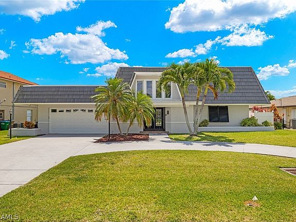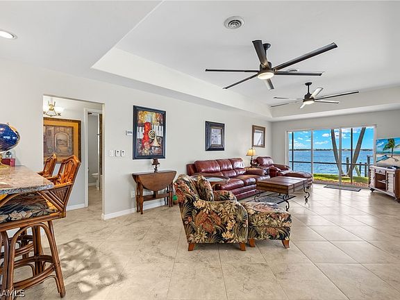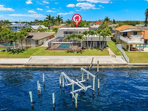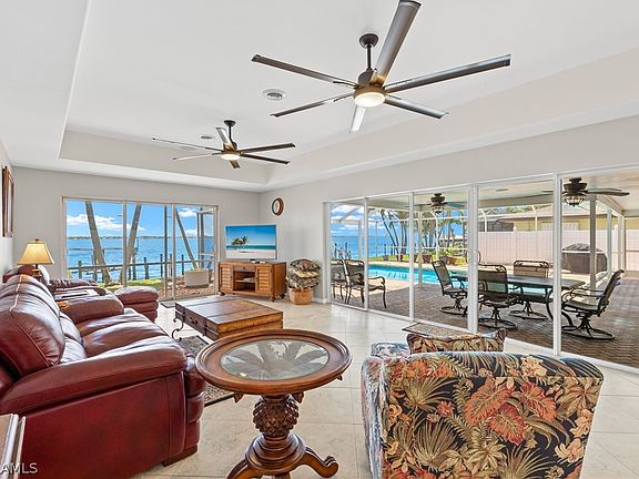 Riverfront Location!!! New Roof 2023, Direct Gulf access, Amazing views, Recently updated 2 story entertainer, circular paver driveway, 2 zones of A/C, living room / game room offers built in cabinets with home office space, billiards table & sliders out to the lanai, updated eat in granite kitchen, with glass tiled backsplash, newer stainless appliances, breakfast bar, recessed lighting, pantry, & a bar area that connects to the spacious tray ceiling family room that offers a captivating panoramic view of the river & provides sliding glass doors out to your picture frame screened heated, paver lanai pool oasis, with plenty of room to entertain all your family & friends, there are two additional guest bedrooms off the family room with another full tiled updated bath, the main bedroom suite is large & on the second floor with all new carpeting with its own screened covered balcony overlooking the pool & the river with a spiral staircase down to the pool area, there is an additional bedroom upstairs with new carpeting, a large walk in closet & another full hall bath with a walk in tiled shower, the dock area offers a very wide concrete seawall area for additional patio furniture or a Tiki Hut, existing boat lift needs repair, auto sprinklers, 25 minutes to the airport, I-75, 25 minutes by boat to Fort Myers Beach & Sanibel Island, this is a must see home for the Location if you are a serious boater & want the Florida life style!!!