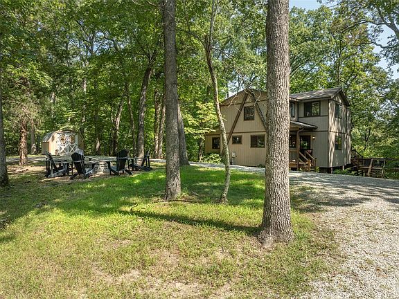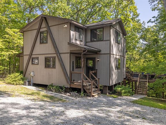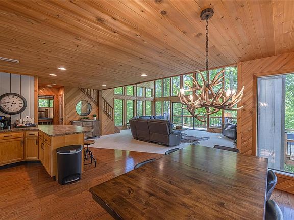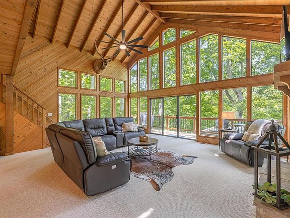 Embrace the beauty of nature and the comfort of luxury with this 3-bed & 2 bath chalet, perfectly positioned on a 4 acre lot adorned with magnificent oak trees. Step inside to discover an inviting great room with a stone fireplace and soaring vaulted ceilings. The massive wall of windows offers panoramic views of the lush, wooded surroundings, bringing the tranquility of the outdoors inside. The kitchen features ample counter space, breakfast bar, and an adjoining dining room for effortless entertaining. Relax and unwind on the expansive multi-tiered deck, complete with a luxurious hot tub and plenty of seating, ideal for both quiet reflection and lively gatherings. Outside, a charming firepit invites you to enjoy crisp evenings under the stars, while the vast, private grounds offer endless opportunities for exploration. This chalet blends rustic charm with modern amenities. The busy rental calendar could be transferred to the new owners. Fully furnished, minus the elk!