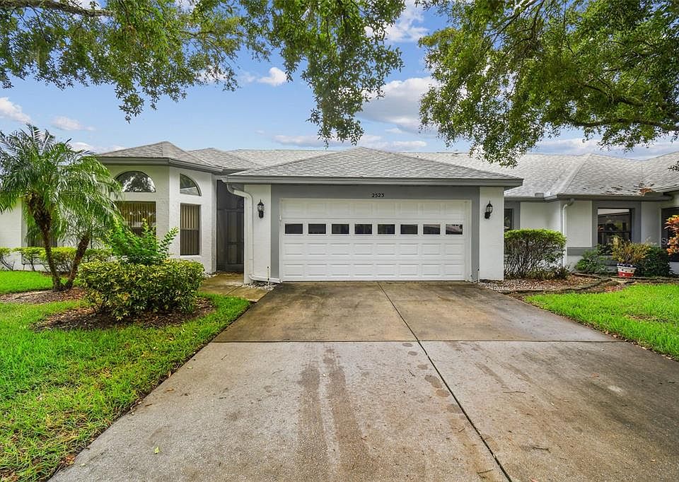 One or more photo(s) has been virtually staged. SELLER SAYS SELL!!! PRICED WELL BELOW COMPS! Welcome to your charming retreat in the heart of a vibrant gated 55+ community in Sun City Center, Florida. Nestled within the serene neighborhood of Kings Point, on a quiet tree-lined street, this delightful home offers comfortable living in a picturesque setting. As you step inside, this recently painted two-bedroom, two-bathroom condominium you are greeted by an inviting open floor plan that's flooded with natural light, creating a warm and welcoming atmosphere. The spacious living area provides ample room for relaxation and entertaining, while the adjacent dining area is perfect for enjoying meals with friends and family. The well-appointed kitchen boasts modern appliances, and updated cabinets, making meal preparation a breeze. There is a bonus room that can be used as an office, den, or a third bedroom! Both bathrooms were recently upgraded, and the home features elegant crown molding in the kitchen, living room, and bonus room! There is a Florida room where you can savor your morning coffee or unwind with a good book while enjoying the tranquil views of the surrounding greenery! Retreat to the comfort of the generously sized master suite, complete with a walk-in closet and an en-suite bathroom with a walk-in shower, dual sinks, and a jacuzzi bathtub. A second bedroom is perfect for a guest room. This lovely home also features a convenient laundry area, a two-car garage, and ample parking on the driveway. The exterior maintenance and grounds maintenance is taken care of by the association, allowing you to spend less time on chores and more time enjoying the array of amenities available in the community. Residents of Kings Point enjoy friendly neighbors and access to a wealth of recreational facilities, including golf courses, tennis courts, swimming pools, fitness centers, and social clubs. With its convenient location near shopping, dining, medical facilities, and major highways, this is truly a place where you can live the active and fulfilling lifestyle you've always dreamed of. Don't miss this opportunity to make 2523 Lynx Road your own slice of paradise. Schedule your private showing today and start living the Florida lifestyle you deserve!