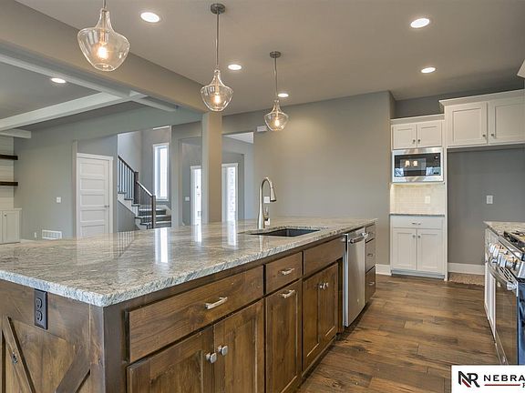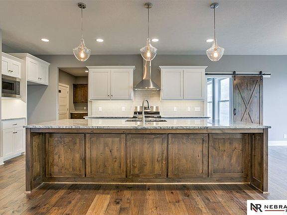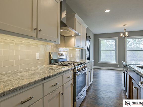 New construction in Elkhorn backs trees on walk out lot! This stunning two-story features 4 bedrooms, 4 baths AND a HUGE 4 car garage! Unique open layout features spacious living spaces, gorgeous dining area, ELEVEN FOOT granite island and barn door leading to the perfect pocket office just off the kitchen. Impressive master suite, second floor laundry, walk in tile shower and so many more must see details! PLUS - 95% furnace, passive radon system, storm shelter, Anderson windows and more! This new 2800+ sq. ft. plan from Heavican Homes is a must see! Final finishes going in now - ready for spring closing!
