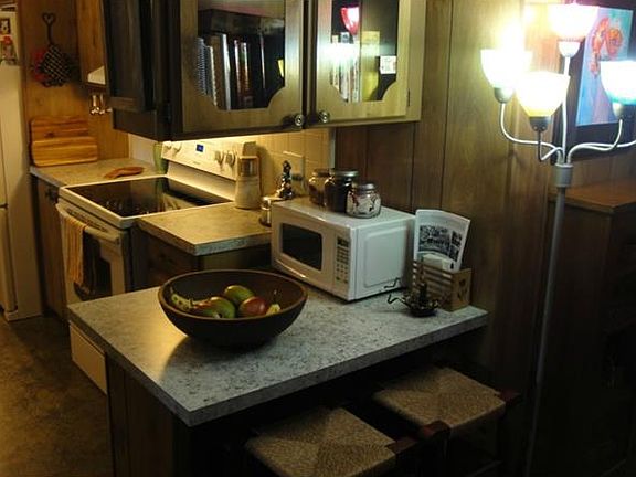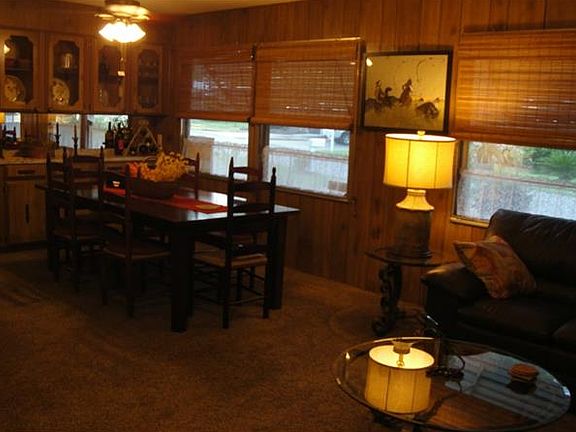 LOCATED ON LITTLE LAKE KERR AND TO BIG LAKE KERR. 3bedroom, 2 full bathroom, 1344sq. ft. not including 2 porches. with porches additional 400 sq. ft. dining room with built in china cabinet, eat in kitchen w/ new appliances, custom master bath with granite and tile, guest bath w/ tile and glass block, 3 season front porch w/ new sliding door into living room, screened porch off of kitchen with outside laundry room, all new carpeting and flooring throughout. new ceiling fans in all rooms. new 3 1/2 ton ac/heat unit with 9 more years guarantee. new hot water heater in garage with complete water filtering system and water softener system. new electric panel , receptacles throughout the home. double windows throughout the house. irrigation well and pump and filters for gardening. 2 1/2 car garage with over sized entry door and 2 other 36 in. entry doors. separate 2 ton a/c unit in garage with separate 100 amp service panel. outside shower, raised garden bed, parking for 3 cars, oversized Lake View lot. lot rent $422.00 per month... park lot rent includes lake access for your boating and fishing. free storage for your RV and boat. Clubhouse and beautiful year round heated pool. park cuts your lawn. local to salts springs state park directly across the street. great fishing at Rodman Dam. access to lake George from across the street. great hunting in Ocala National Forest!