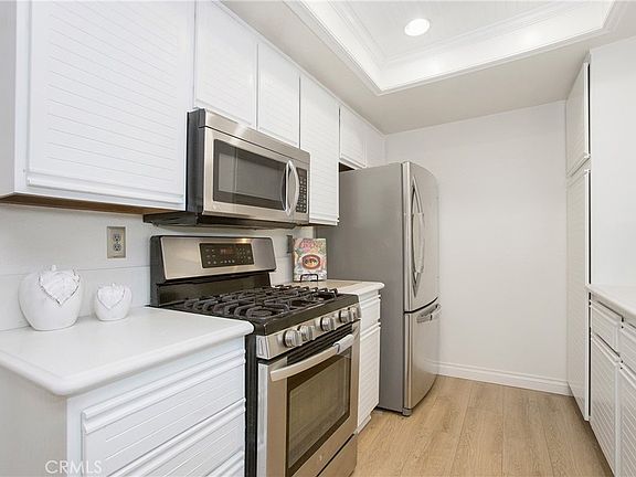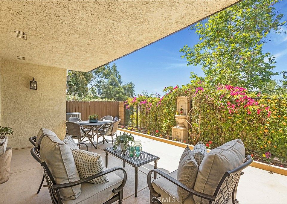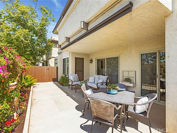 Such a great location! Enjoy the openness and serenity beyond your flower filled patio. Great floorplan with en-suite main bedroom and secondary bedroom next to full bath. Both bedrooms and living room open out to the patio. Freshly painted throughout. Inside laundry and direct access garage plus a long driveway. Low maintenance concrete patio with pull-down blinds and large planting area. Lots of upgrades -- new double-pane sliders and windows, crown molding, luxury vinyl flooring throughout, quartz countertops, newer water heater, dishwasher, air conditioner, and bath fixtures. Ceiling fans in bedrooms and living room. This area of Lake Forest is perfect for easy access to Irvine, the 241 toll road, Lake Forest Sports Park, Etnies Skatepark, shopping and restaurants. The Homeowner's Association has a pool and spa plus there are nearby parks and lots of hiking trails.