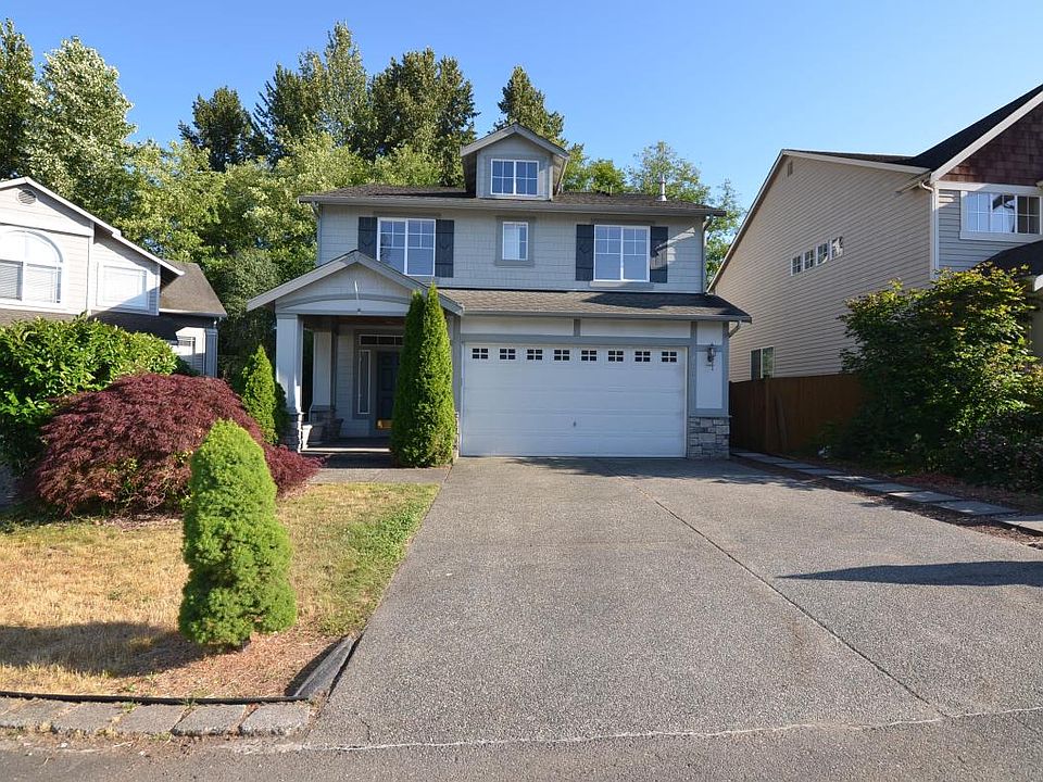 Great home with newer carpet and refinished hardwood floors on main floor. The home is easy living with spacious bedroom and enormous master suite including 5 piece master bath, master den and walk in closet. 2 gas fire places, front loading washer/dryer and two car garage. Enjoy the private backyard with large deck backing to green belt. First months rent and security. One year lease