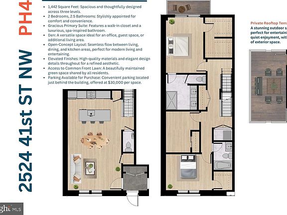 Experience luxurious urban living in this stunning two-level penthouse, offering 1,442 square feet of flexible and expansive space. With 3 bedrooms and 2.5 bathrooms, this home is designed for modern comfort and convenience. The primary suite features a spacious walk-in closet and a beautifully appointed bathroom, creating the perfect retreat. Enjoy bright, airy interiors with natural light streaming in. Step outside to your private 180-square-foot rooftop terrace, ideal for both entertaining and unwinding while taking in breathtaking views of the city. Building Features: This fully renovated boutique walk-up condominium blends timeless charm with contemporary updates, ensuring energy efficiency and low maintenance. The building's upgrades include all-new systems and finishes, offering a perfect mix of style and functionality. Residents enjoy exclusive access to a beautifully maintained front lawn, a tranquil green space perfect for relaxation. Units 1 and 2 each have their own private outdoor areas, while Units 3 and 4 feature stunning rooftop terraces. Parking Available: Optional parking spaces are available for purchase behind the building for $30,000, providing added convenience in this prime location. Phenomenal Location: Situated in one of Washington, D.C.'s most desirable neighborhoods, this residence is just steps from retail, grocery stores, restaurants, Stoddert Elementary School, and the scenic trails of Glover Archbold Park. Coming Soon: Units 1, 2 will be available soon, offering additional opportunities to live in this exceptional building.