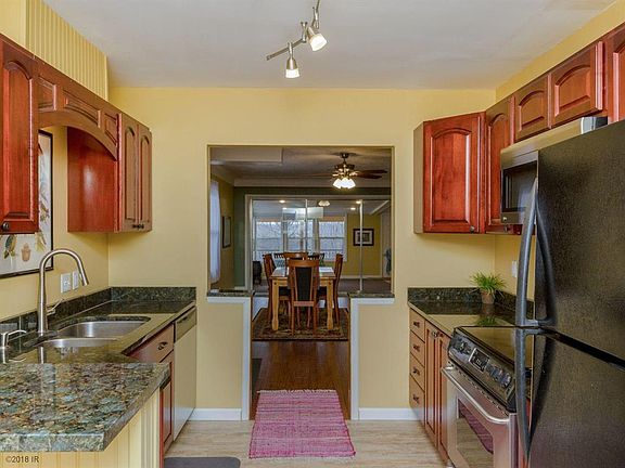 Special touches highlight this immaculate brick ranch. The remodeled kitchen features beautiful cabinetry, granite countertops, a breakfast bar and stainless steel appliances. An updated full bath is conveniently located near two nicely sized bedrooms. Attractive laminate flooring, wide base trim and cove accent highlight the living room. An impressive three pane glass slider off the living room accentuates this open floor plan. A spacious 3-season room with its corner fireplace completes the main level. The walkout basement has newly installed laminate flooring and offers excellent potential for additional living space. A one-car attached garage has an adjoining area which is perfect for a workshop or additional storage. Other amenities include a composite deck, and new windows and flooring throughout the main level.