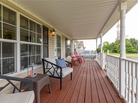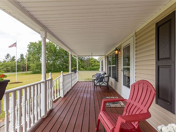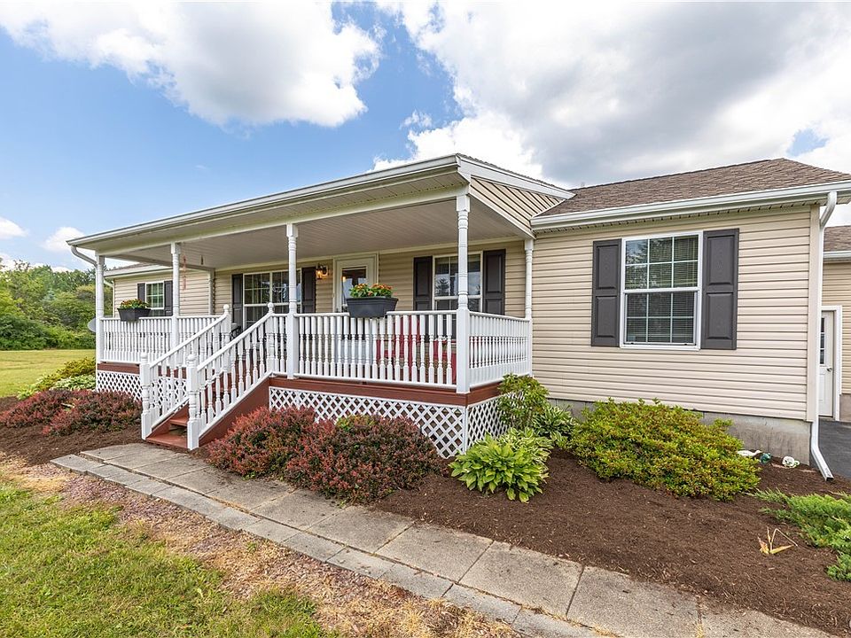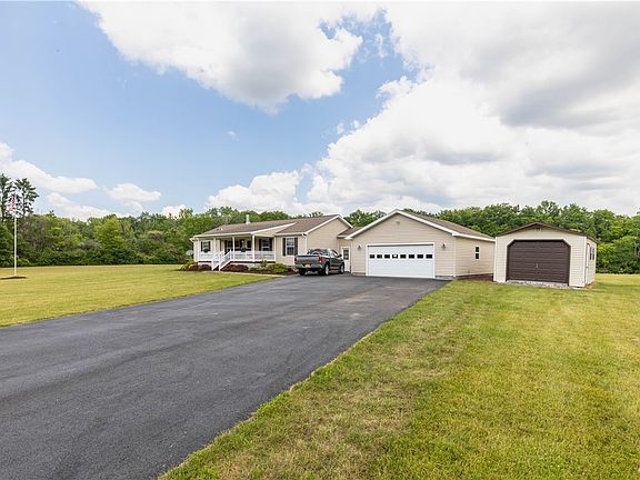 Situated on a picturesque 4-acre parcel of level, grassy land, this property offers the perfect blend of tranquility and functionality. This charming ranch with a large covered front porch is an exceptional find. As you step inside, you'll immediately notice the warm and inviting atmosphere and vaulted ceilings. The spacious layout provides ample space for relaxation and privacy. The main bedroom with its own en-suite bathroom offers a peaceful retreat. The heart of the home is the expansive kitchen, complete with a huge island that provides plenty of space for meal prep, eating & entertaining guests. Next to the kitchen is a convenient laundry area & mudroom. A cozy wood-burning fireplace, which serves as a focal point in the living room, is a perfect place to curl up on a chilly evening to enjoy a crackling fire and savor the peaceful ambiance. Whether you're an avid hobbyist, a car enthusiast, or simply in need of extra space, you’ll love the detached two-car garage & spacious shed. Need or want more space? The full basement offers endless possibilities for customization, allowing you to transform it into a home theater, a recreational area, or even a home gym.