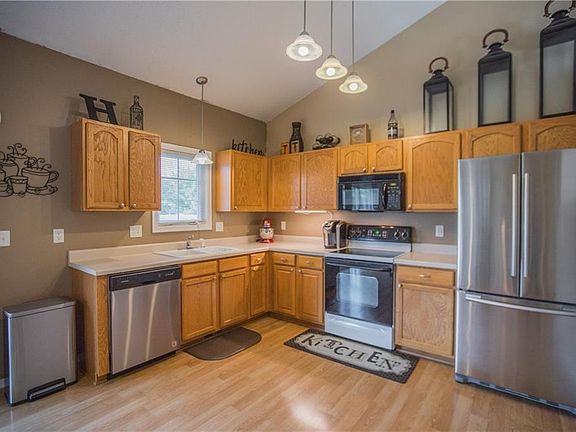 Split level with finished walk-out basement and fenced yard. Main floor living room with vaulted ceiling and huge eat in kitchen with access to deck. The kitchen overlooks the cozy family room with fireplace and access to lovely open patio. Attached garage and half bath / laundry area. Lower level is finished and has even more living space can be used as private office or 4th bedroom. Storage room and more storage under stairs. Well maintained, freshly painted. Nice curb appeal and landscaping. Great floorplan