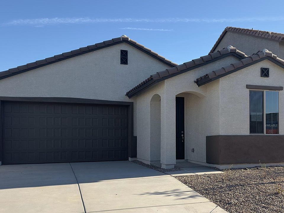 Beautiful home with three bedrooms plus a private office or craft room! On a lot with mountain views, 8' garage door, Smart garage door opener and a covered patio. Split primary bedroom with large walk-in closet, dual sinks. We have 9' ceilings and added 8' interior doors, cabinets in the laundry room and square sinks in both bathrooms too. Separate dining for family dinners. Entertainer's kitchen with Sinclair Saddle cabinets, chrome hardware and fixtures. Island with breakfast bar makes food prepping fun, upgraded faucet, single bowl sink, beautiful granite countertops and GE stainless steel appliances. Refrigerator, washer, dryer, blinds included. Upgraded 12''x24'' tile throughout except carpet in bedrooms & closets. Move-in is January. Very popular plan and $21,600 incentive!