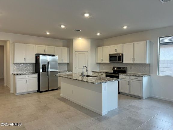READY now! NO back neighbor, n/s lot with mountain views. Featuring countless upgrades, energy efficient beauty such as soft water loop in the garage, keyless entry, 8' garage door, Smart Home package, electrical upgrades you'll want to have. Home has 9' ceilings, half bath for guests, spacious bedrooms, split floor plan, pocket office or craft room, double sinks at primary bath and bath 2. Entertainer's kitchen! Large island with single bowl sink, breakfast bar, walk-in pantry, beautiful granite counters, herringbone backsplash, white shaker cabinets, chrome hardware and finishes, GE stainless steel appliances. Tile throughout except bedrooms and closets, large covered patio too! This is your home for the new year! Don't miss out.