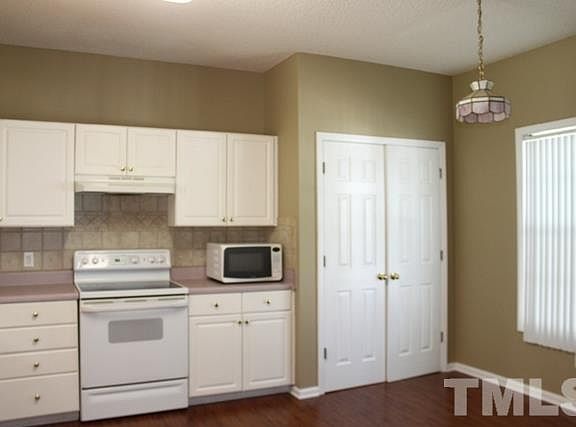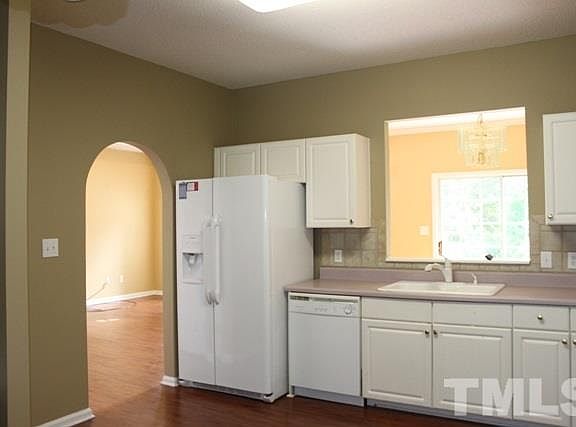 Home in Trailwood Hills with fenced back yard! It has three large bedrooms (all at least 11x12) on the second floor. First floor has hardwood look laminate floors throughout. The family room has vaulted ceilings, and a pass through window looking in to kitchen. Kitchen has tile backsplash and plenty of space to eat in. Laundry room with a washer and dryer included. Single car garage and flat back yard. Great location close to NC State and major highways.