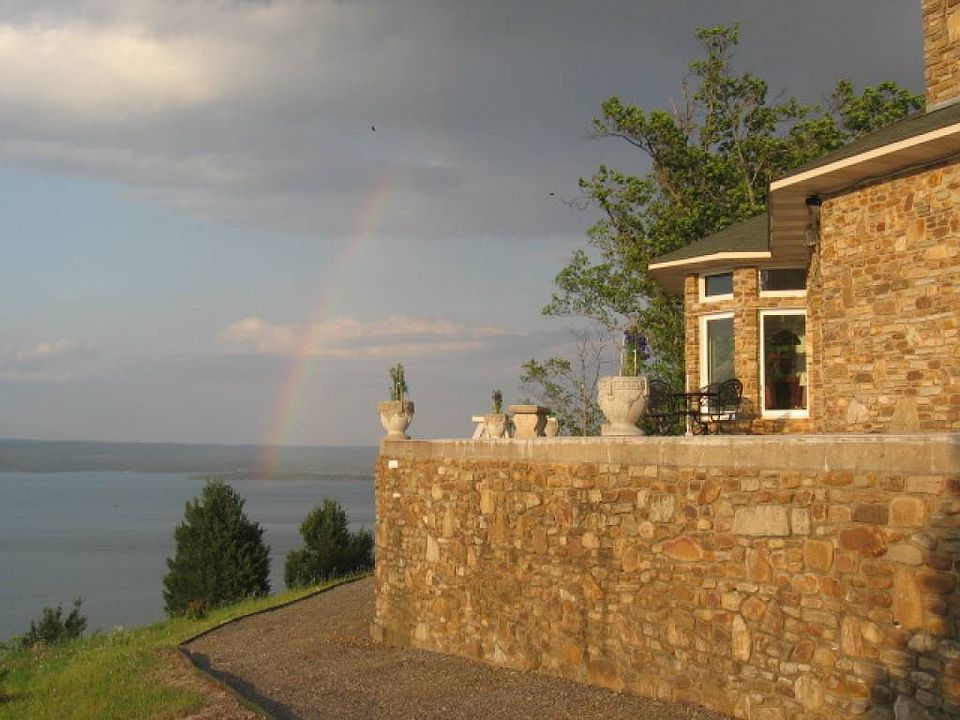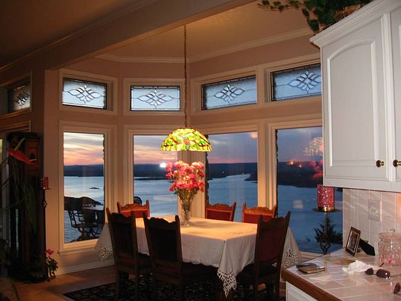 Custom, mountain top, rock house with open, panoramic view of Greers Ferry Lake. Diamond Bluff area,double lot, total privacy. Open floor plan, 2 or 3 bedrooms 10 ft ceilings, large natural fireplace. A view from every room, showcased in antique stained glass and beveled glass\nwindows. 2900 s.ft.of living space complimented with a 100 X 16 ft. Tiled porch for outdoor living,endless sunsets, sunrises, sky watching, parties etc. One story, no stairs, 15 inch thick walls circular drive, landscaped, 2.5 car garage with 3500 watt generator. Lighted, tiled courtyard at entrance. All rock work by Mountain View Johnny Williams. Please visit http://www.listingcheckout.com/rdcd/126988 for an important notice about this property.