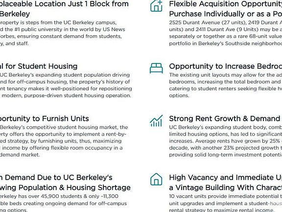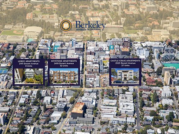The Cushman & Wakefield Northern California Capital Markets Group is pleased to present The Castle Craig Apartments, a distinguished 27-unit multifamily asset located in an irreplaceable location at 2525 Durant Avenue in the highly sought-after Southside neighborhood of Berkeley, CA. Built in 1928, this 17,802-square-foot property boasts classic architectural character and presents a prime investment opportunity just steps away from the world-renowned UC Berkeley campus. Offered for the first time in more than 50 years, The Leroy Apartments represents a truly unique chance to secure a generational multifamily investment in one of the Bay Area's most dynamic rental markets. The property's unit mix consists of 13 studios, 12 one-bedroom units, and 2 two-bedroom units, catering to a diverse range of tenants, including UC Berkeley students, faculty, and local professionals seeking direct adjacency to UC Berkeley. There is immediate value-add potential for an investor to implement property upgrades to 10 units and implement a modern purpose-driven student housing operation. The property can be purchased individually or as a 3-property, 68-unit portfolio with The Keystone Apartments (2419 Durant Avenue - 32 Units) & The Leroy Apartments (2411 Durant Avenue - 9 Units).