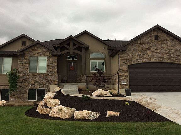 A beautiful rambler style home built in 2013 located right off highway 89 with stunning mountain views. Three bedrooms, two and a half bath, 3564 square feet, with daylight basement windows. Plantation shutters present throughout the main level. Granite countertops in the kitchen, master bath and second bath. Kitchen includes upgraded knotty alder cabinets as well as antiqued finished cabinets on the hood, stove drawers and island, double ovens, large five gas burner stove top, stainless steel appliances, double spice racks. Beautiful hardwood floors located throughout the house, carpet in the bedrooms, tile in the bathrooms & laundry room. Rustic wood timber arch over the front entryway. The backyard has great mountain views, tree covered berm provides privacy & seclusion, gas fire pit, pavers, two 8x4 garden boxes with dedicated sprinkling station. 12 foot wide, extra long concrete RV pad. Three car garage with additional shop space, sink, painted walls, and painted floors. Throughout the house you will find canned lighting, oil rubbed bronze faucets & door handles. Water softener added in 2017. Great location in the upper south east portion of South Weber, close to east Layton and out of the lower canyon wind tunnel.